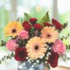 Mixture of arrangement with Roses, Gerberas and Rose spray with wax flowers and baby breath.   Spark joy to everyone you know today!