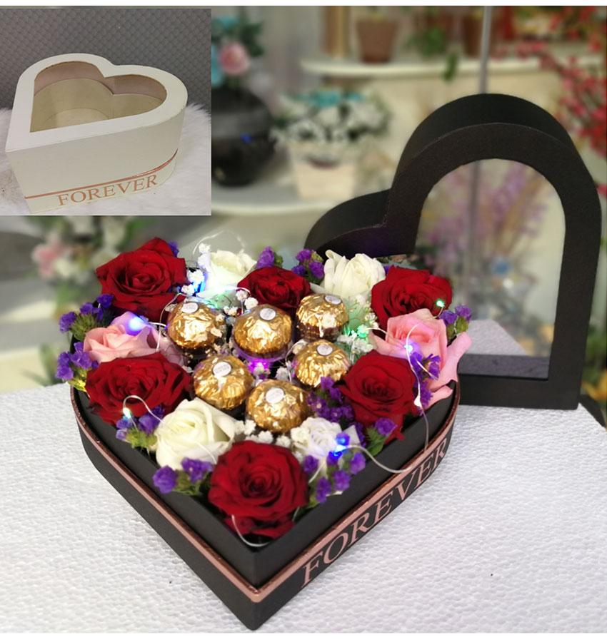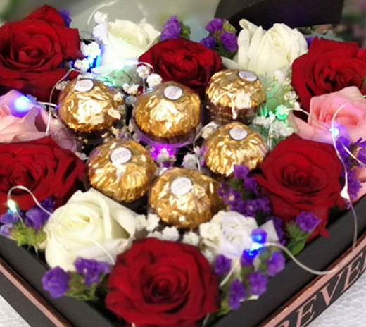 12 roses and 6 Ferrero Rocher in a heart-shaped box with LED light.