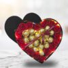 Red Roses with ferrero rocher arranged in the center of the heartshape box.