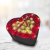 Red Roses with ferrero rocher arranged in the center of the heartshape box.