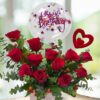 Red roses, bubble balloon and heart stick arranged in a box