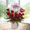 Red roses, bubble balloon and heart stick arranged in a box