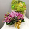 Basket of 6 chicken essence, premium imported fruits (grapes, pears, peach, plum, blueberry, melon, kiwi, strawberry, apples, oranges etc) and a basket of flower arrangement with imported hydrangea & lilies.