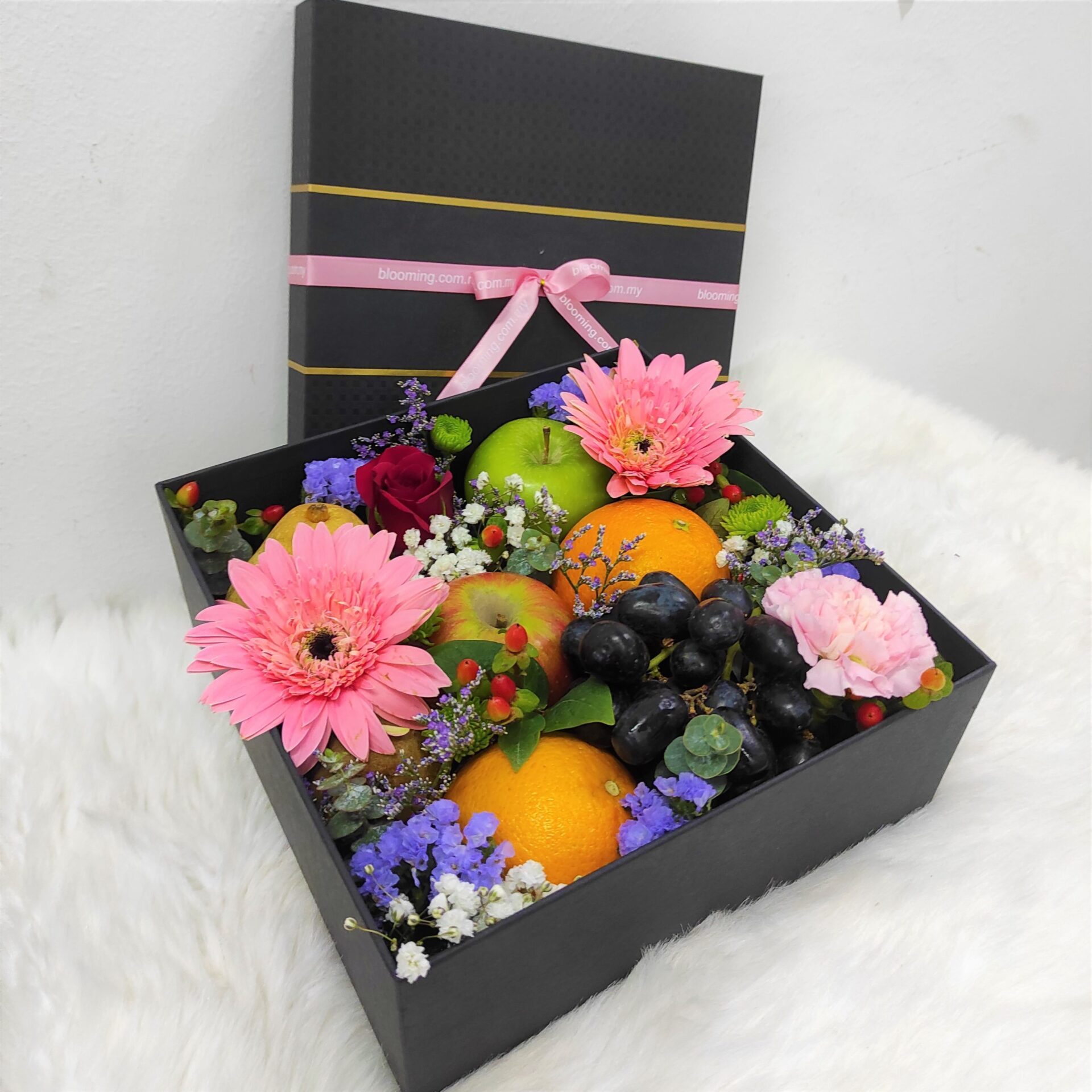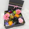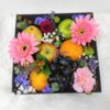 An arrangement of coloured blooms and premium fruits in a gorgeous gift box.