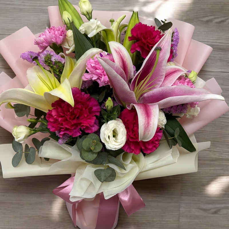 Our signature Lily and Carnation bouquet combines the timeless elegance of lilies with the delicate charm of carnations, creating a stunning arrangement that embodies both sophistication and beauty.