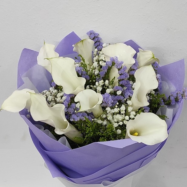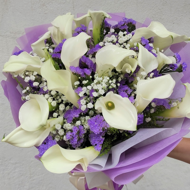 A luxury calla lily bouquet delivery is a sweetly sophisticated way to show your warmest wishes. The Graceful Calla Lily Bouquet blossoms with exquisite beauty and elegance. Delightful white open cut calla lilies and white mini calla lilies create a superb high end display of tranquility and grace.  This flower arrangement is a wonderful way to captivate your recipient for an anniversary, to express your heartfelt gratitude, or to offer comfort and sympathy.