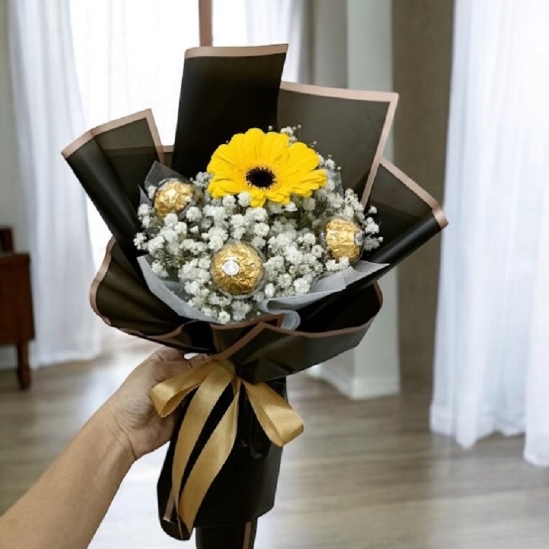 Single daisy with Ferrero Rocher chocolate in bouquet.