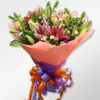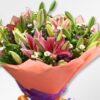 12 mixed lilies arranged in a round hand bouquet with white & purple peacocks, beautifully decorated with matching netting, papers & ribbons