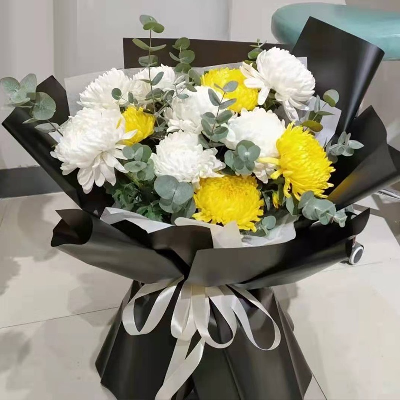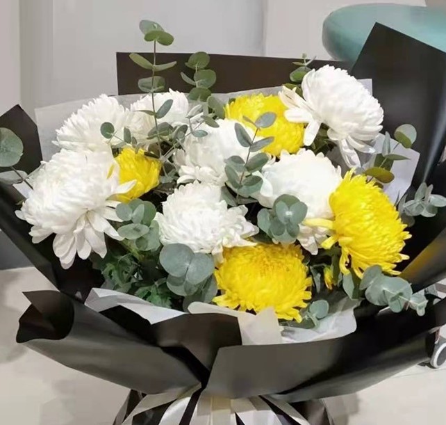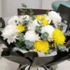 Condolence bouquet of mixed white and yellow mum with eucalyptus.