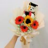 Sunflower and daisy with graduation bear (medium) in a hand bouquet