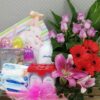 Hamper Set of new born baby talcum, toiletries, wet wipe, bottles and baby clothes set with flower arrangement.