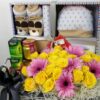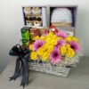 Basket floral arrangement with 3 bottles of chicken essence, 3 bottles of rock sugar bird nest and baby clothes set.