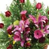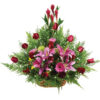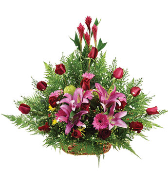 15 roses, 2 lilies & 3 daisies arranged in a basket.