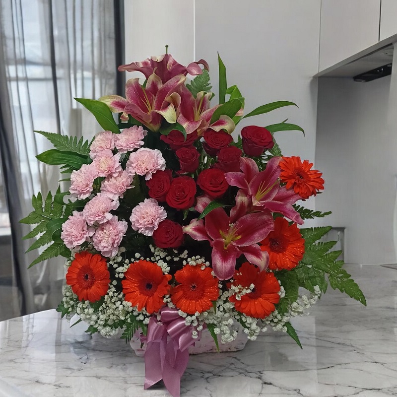17-18 red roses. 17-18 pink carnation, 10 daisy, 4 stalks pink lilies with baby breath.