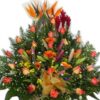 An arrangement of fresh roses, lilies, gerberas, birds of paradise and gingers.