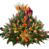 An arrangement of fresh roses, lilies, gerberas, birds of paradise and gingers.