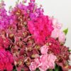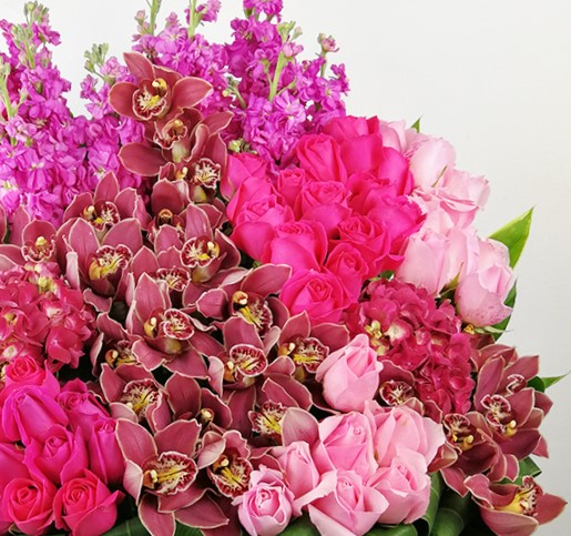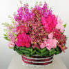 Basket of imported Cymbidium, hydrangea, mathiola & roses.