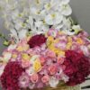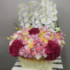 Phalaenopsis orchids mixed with eustoma, roses and hydrangea arranged in a grand basket.