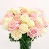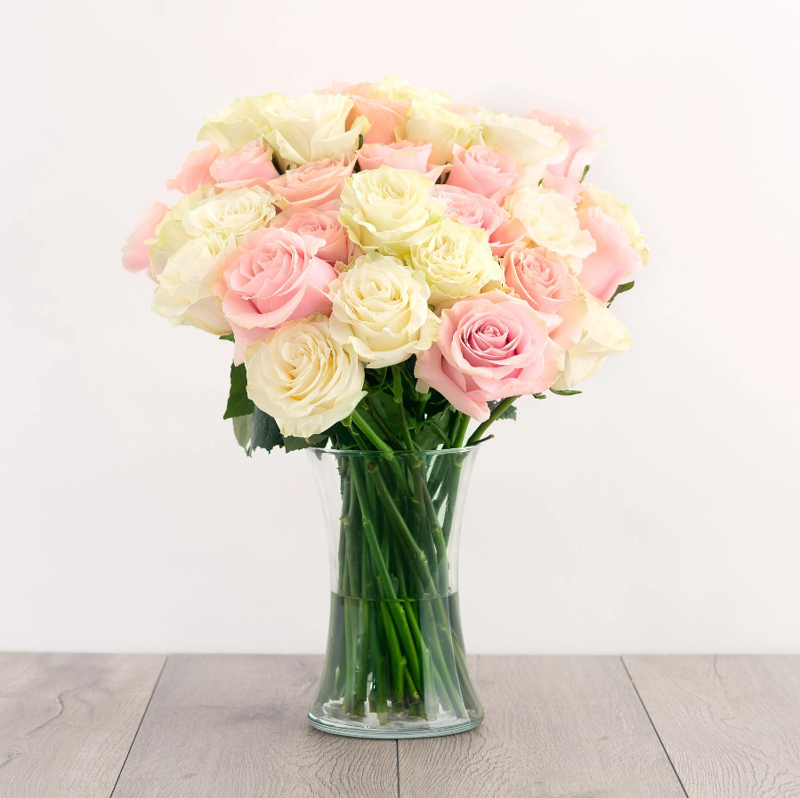 The flowers feel so lovely, real, and lively.    Arrangement contains real touch 30 mixed pink and white shades of roses in a clear glass vase.