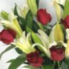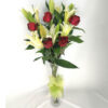 6 mixed Liles, 5 Roses in tall vase.