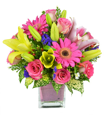 Lorie (roses, daisies and lilies). 8 roses, 4 daisies & 3 lilies in a vase.