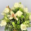 12 white roses & 5 mixed lilies flowers in a vase/pot